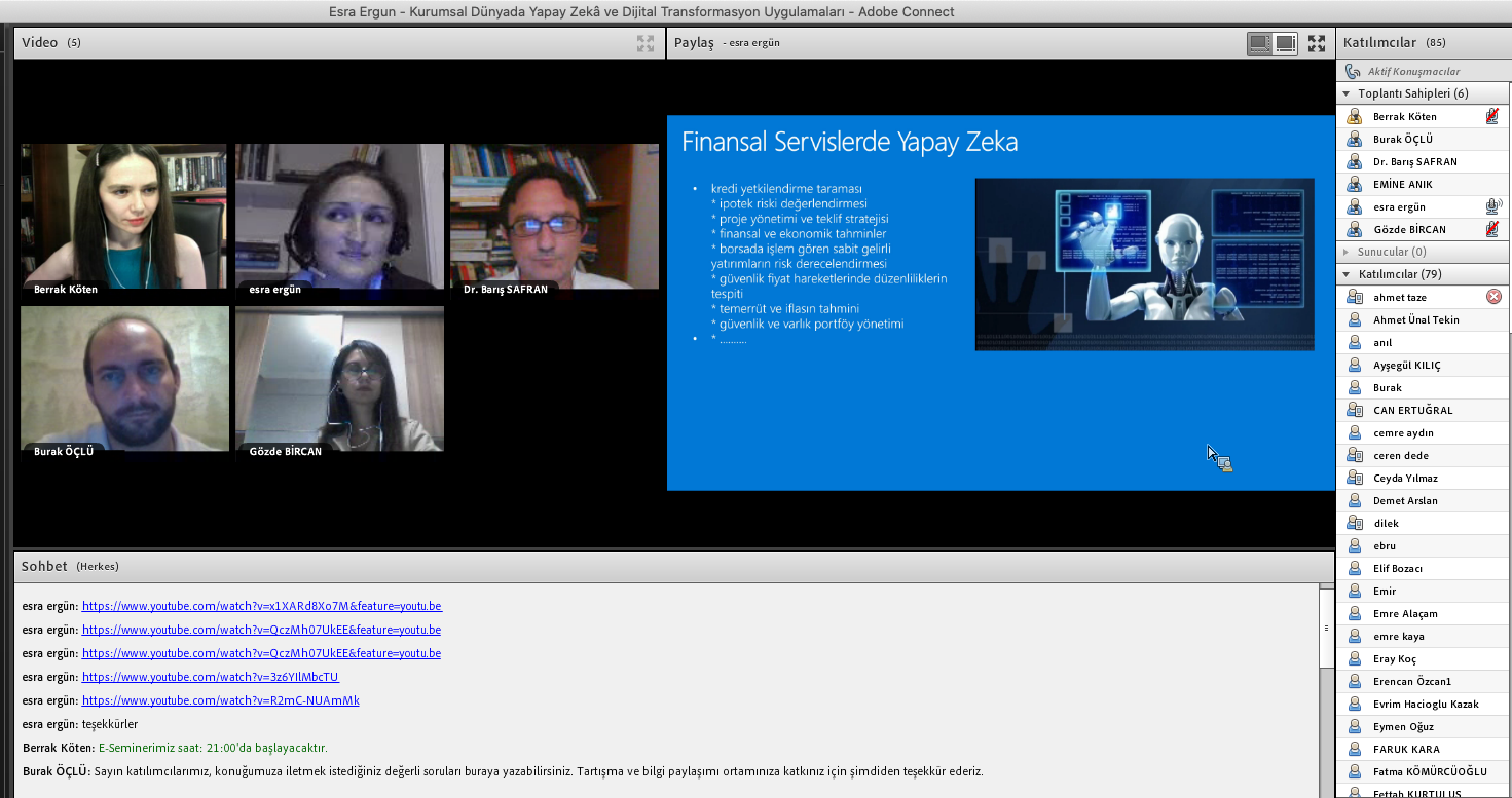 Öğr. Gör. Berrak Köten, Öğr. Gör. Dr. Barış Safran, Öğr. Gör. Burak Öçlü ve Öğr. Gör. Gözde Bircan ile ve tüm katılımcıların sorularını yanıtlayan Esra Ergün yapay zekâ uygulamalarının yaygınlaşmasıyla çok çeşitli disiplinleri içinde barındırdığını belirterek uzmanlık ve ilgi alanları doğrultusunda odaklanılması gerektiğinin altını çizdi. Öğrencilerimize, bu alandaki sektörel yayınları, işletmecilik dergilerini ve webinarları takip etmelerini önerdi.